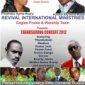 The Revival International Ministries‘ Apostle and Prophetess Mujeyi present the 2012 Thanksgiving Concert. Date: December 15 Time: 15:00-20:00 Venue: Presbyterian church (opposite Crowne Plaza Hotel) in Harare Performers: Jibilika Dance Group, Beauty James, Dorcas, Trevor Dongo, Thembelami, Mudiwa, Pastors Josh and Farai Contact: